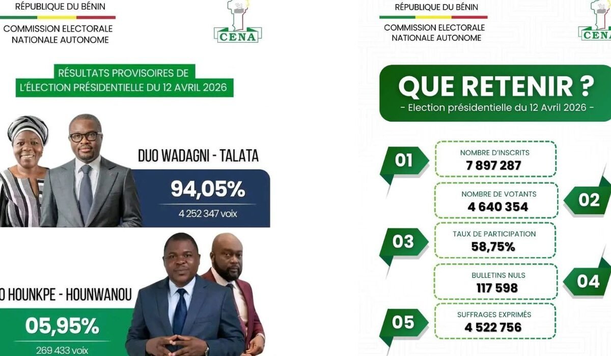 La Commission électorale nationale autonome (CENA) a rendu publics les résultats provisoires après le dépouillement d’une grande partie des bureaux de vote. Selon les chiffres annoncés, le ticket composé de Romuald Wadagni et de Mariam Chabi Talata obtient 94,05 % des suffrages exprimés. L’opposition conduite par Paul Hounkpè recueille 5,95 % des voix. Le taux de participation est estimé à 58,75 %, un niveau jugé relativement stable pour ce scrutin présidentiel.
