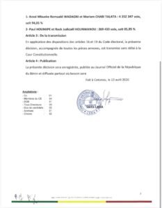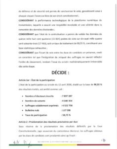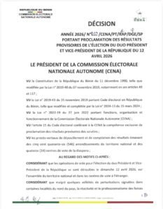 La CENA précise que ces résultats restent provisoires, même si les tendances semblent largement irréversibles au vu de l’ampleur de l’écart. Le processus électoral doit désormais suivre son cours institutionnel. La validation finale revient à la Cour constitutionnelle du Bénin, seule habilitée à proclamer les résultats définitifs. Cette étape marque une phase décisive du scrutin, dans l’attente de la confirmation officielle des résultats et de la proclamation du président élu.