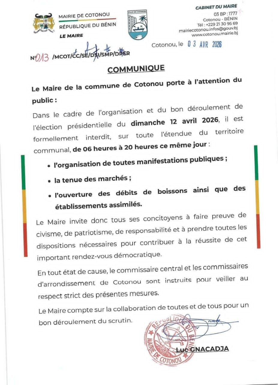 L’objectif est d’assurer le bon déroulement du scrutin. Le maire appelle ses concitoyens au civisme, au patriotisme et à la responsabilité. Il les invite à prendre toutes les dispositions nécessaires. Le commissaire central et les commissaires d’arrondissement de Cotonou sont chargés de veiller au respect strict de ces mesures. La mairie compte sur la collaboration de tous pour la réussite de ce rendez-vous démocratique.